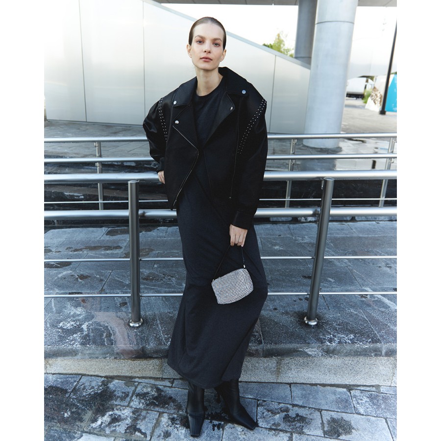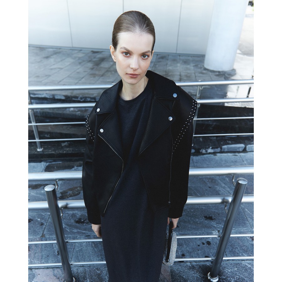 Стильная кожаная куртка с клепками и акцентом на плечах подчеркнет хрупкость фигуры и внесет дерзкую нотку в повседневный аутфит. Оригинальный вариант привычной «косухи», интерпретированный с учетом современных трендов.